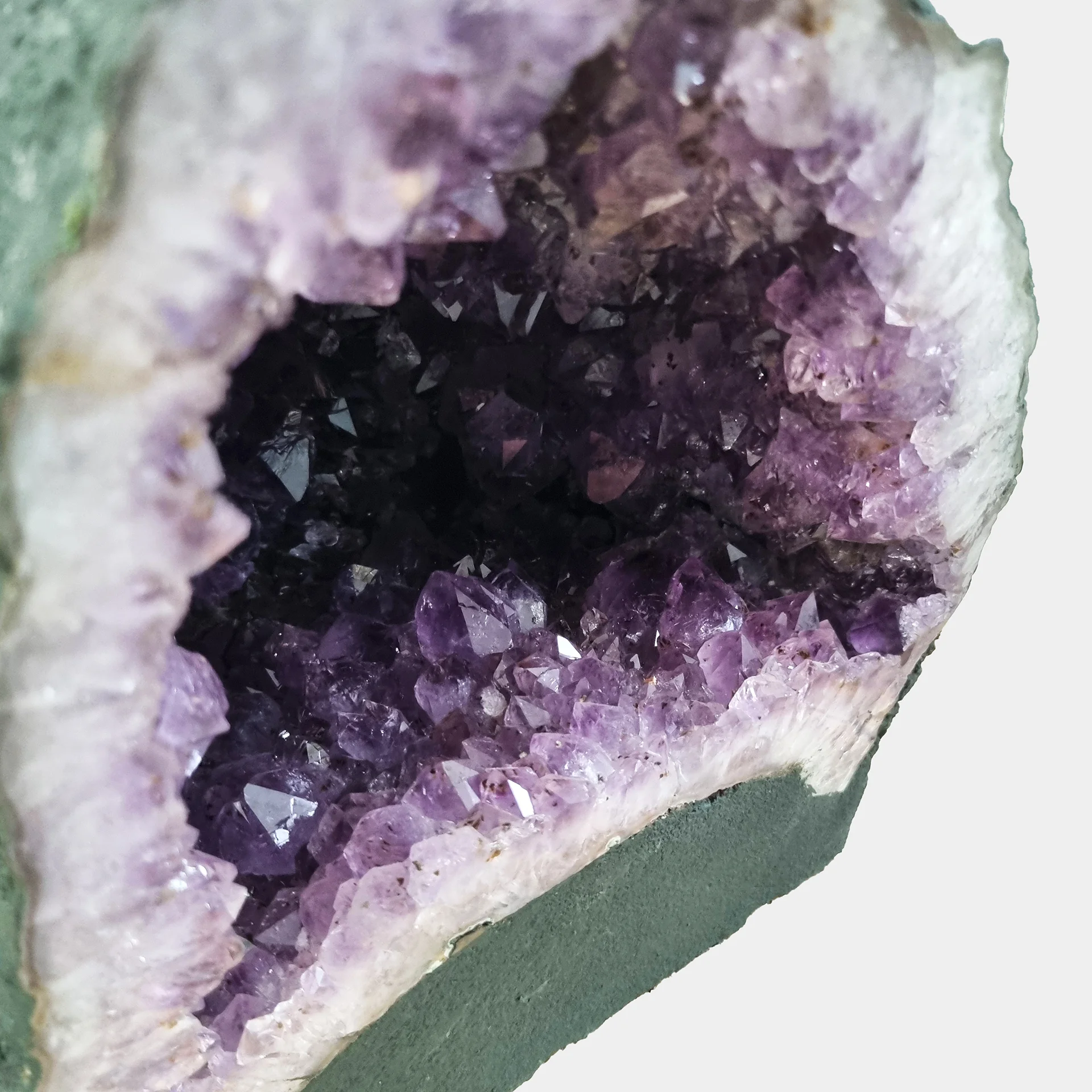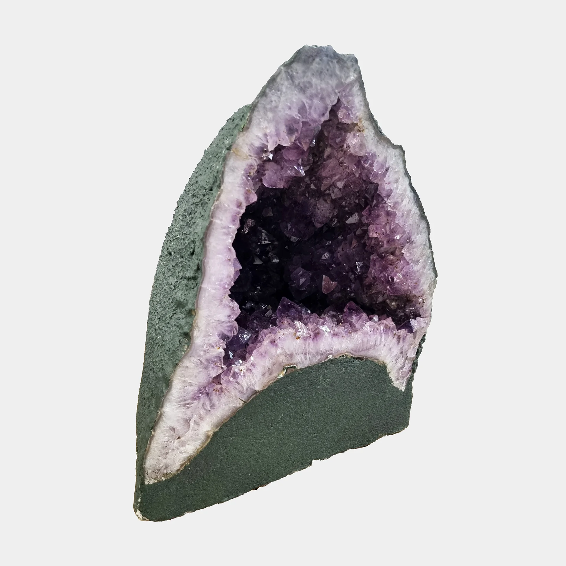 The crystal chamber opens in a smooth arch, revealing clean layers and a dense crystal texture. Its surface reflects subtle light from every angle, highlighting the natural structure shaped over millions of years.