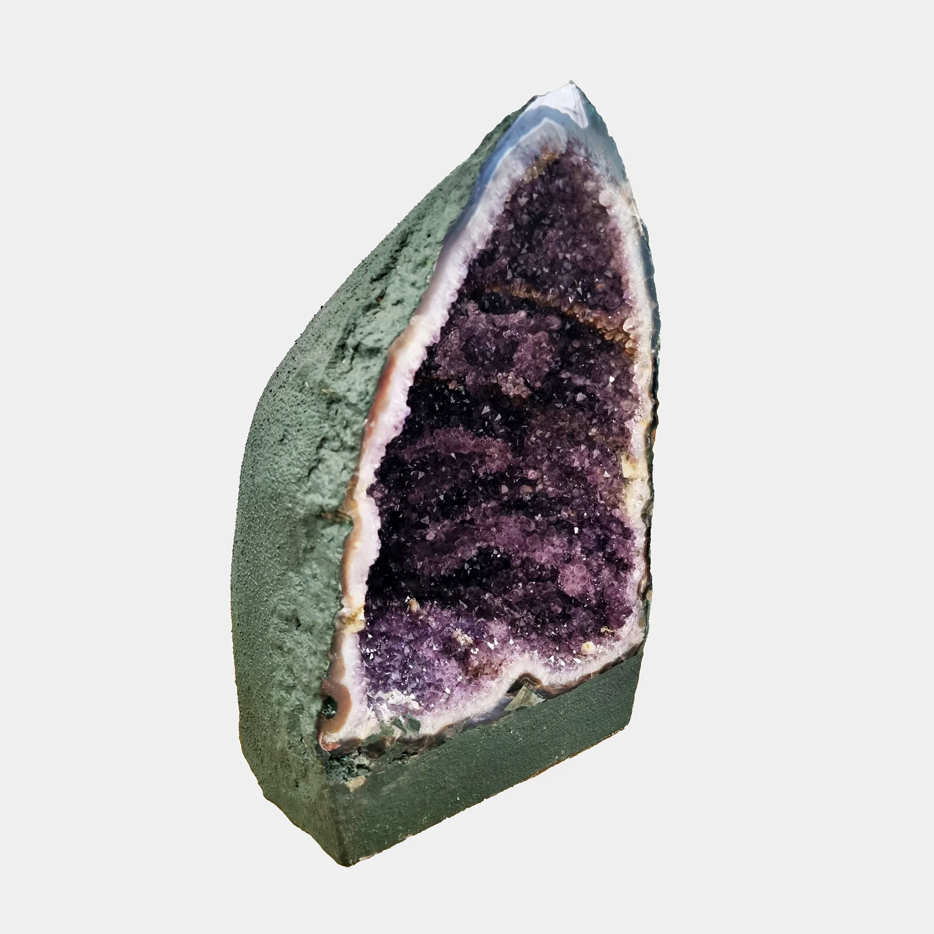 The open chamber reveals clear crystal definition and a smooth arched outline, creating a balanced appearance from every angle. Subtle mineral details — including agate and pale quartz bands — highlight the natural growth patterns formed deep within the Earth.