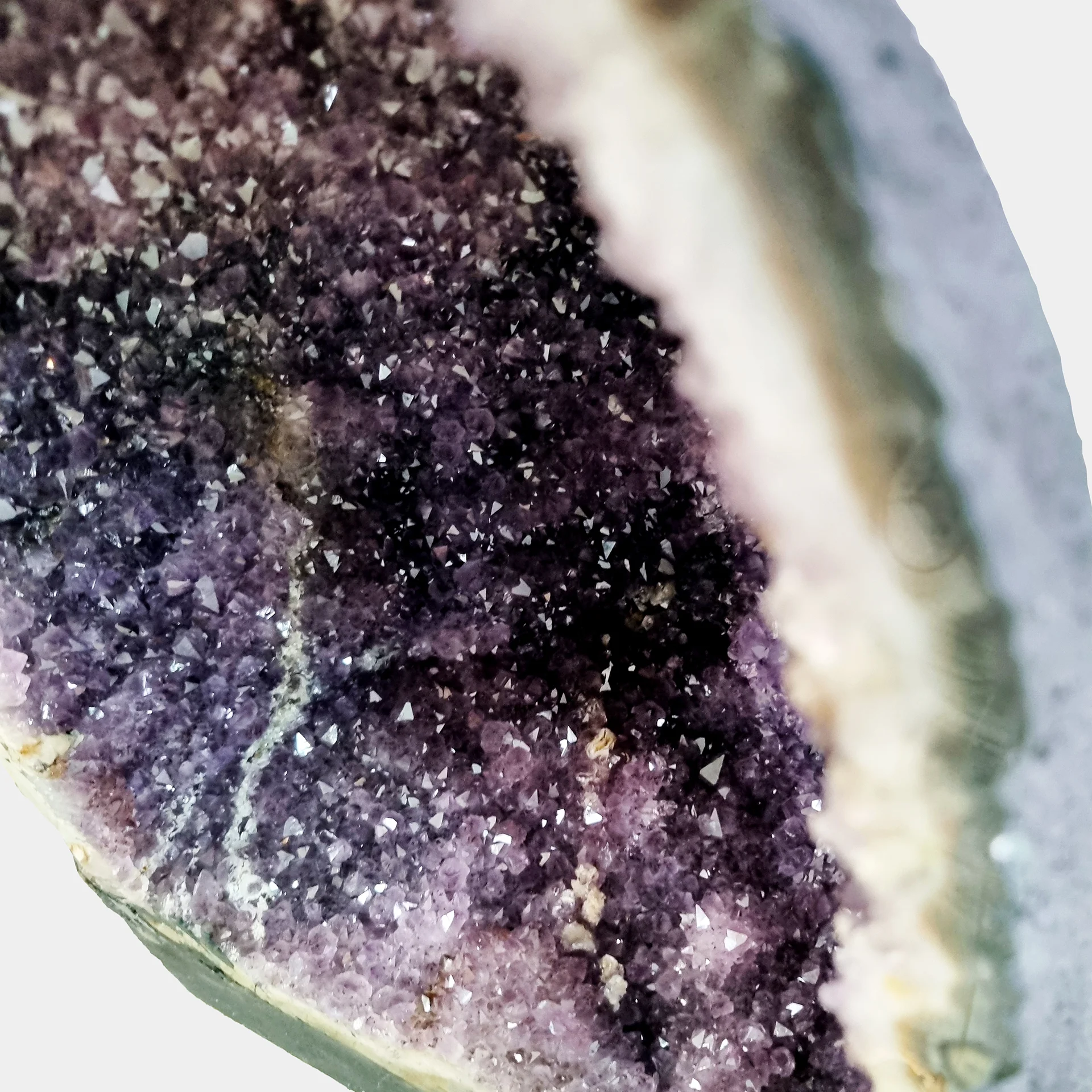 - Color: Vivid violet center with lilac transitions and pale quartz bands