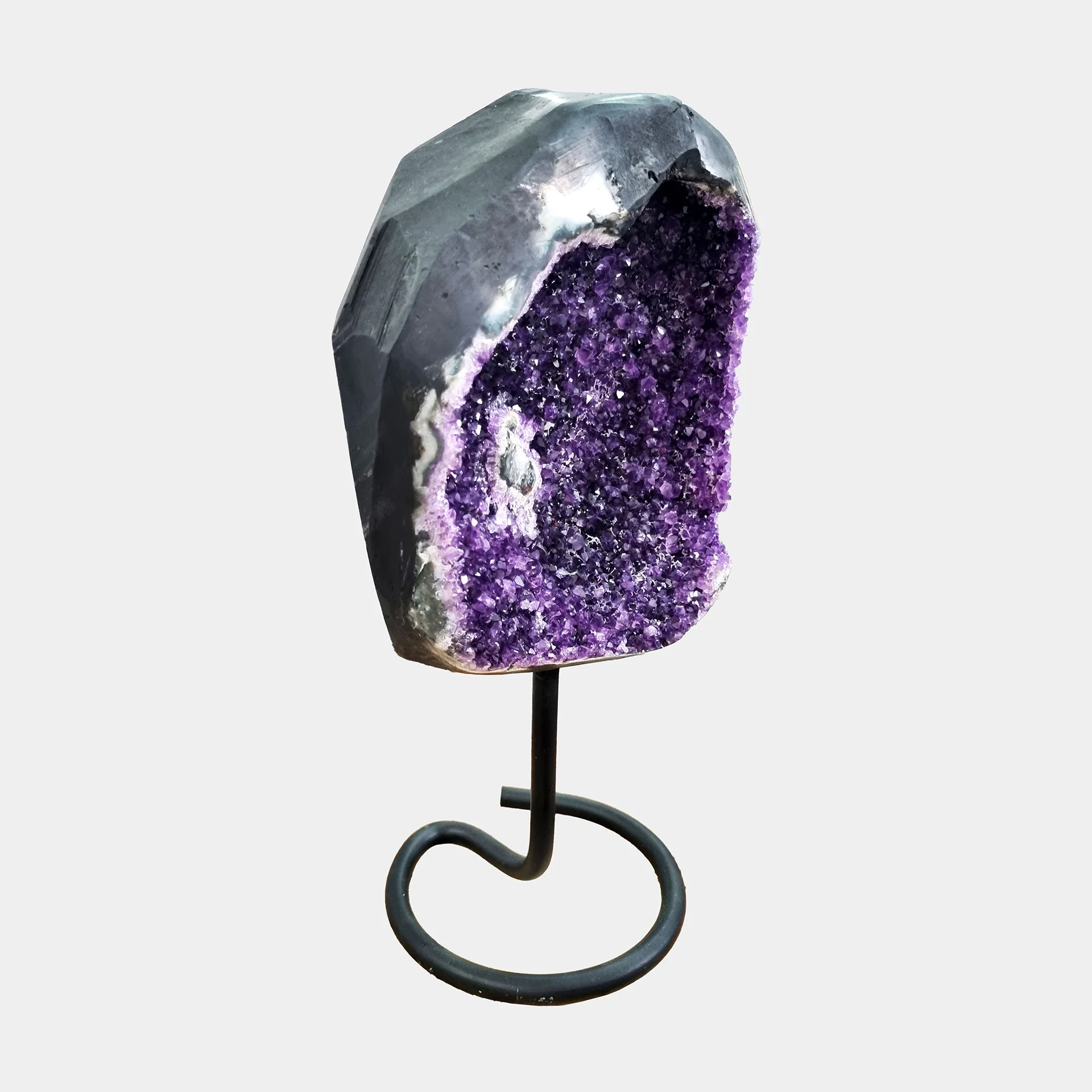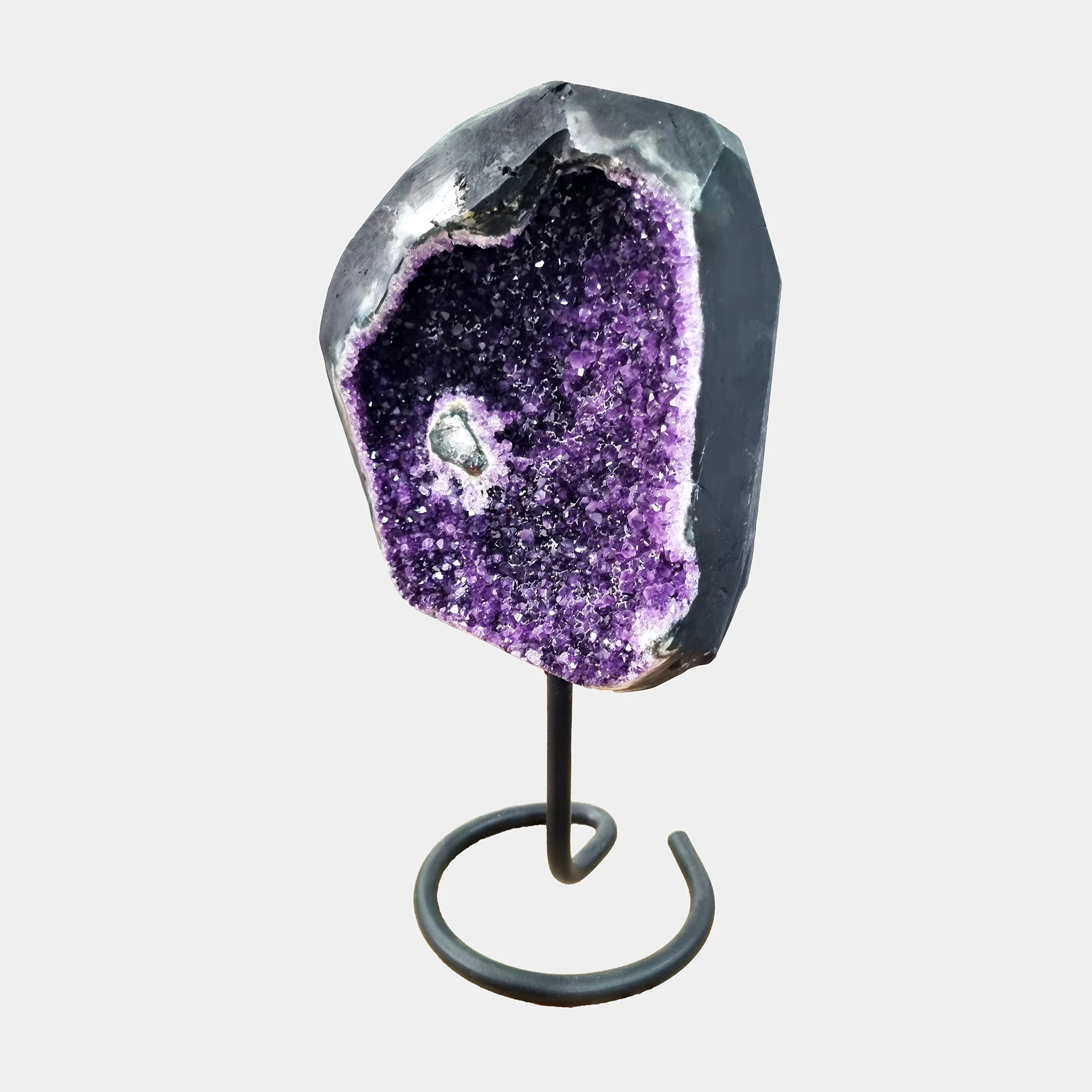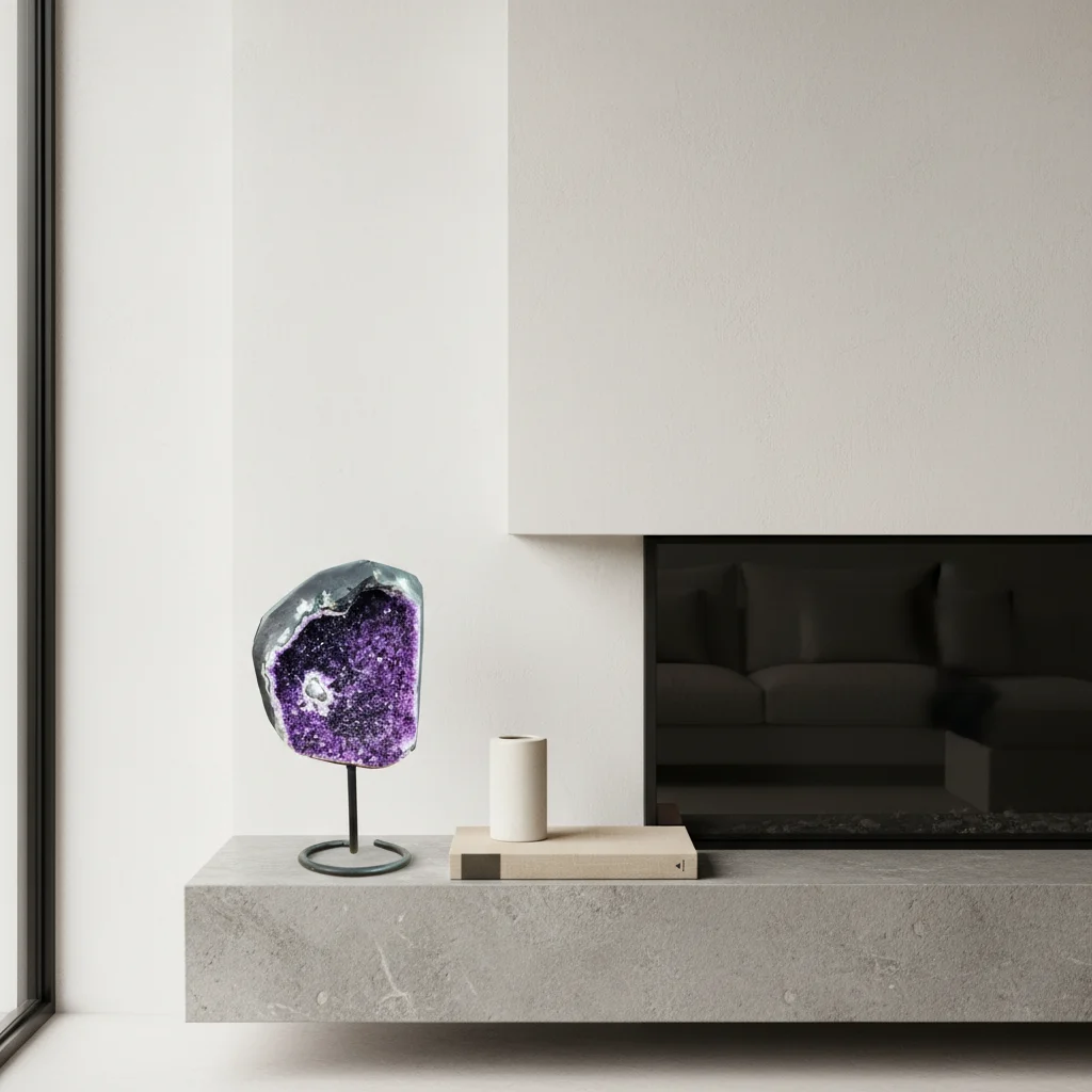 Hand-selected in Brazil, this exceptional Amethyst reveals a luminous geode filled with deep violet crystals and a rare natural inclusion at its heart. Elevated on an elegant black metal stand, it radiates serene beauty, timeless elegance, and the quiet power of nature.