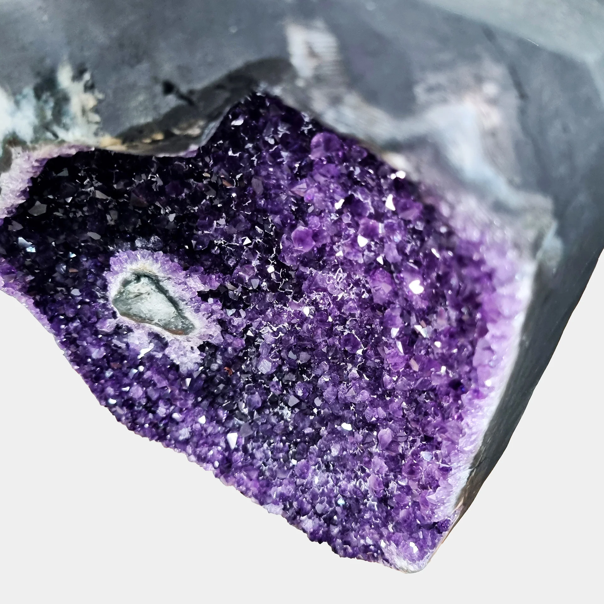 From Brazil’s renowned mineral fields, this Amethyst reveals a captivating geode formation filled with radiant violet crystals and a rare internal inclusion that forms its mesmerizing centerpiece.