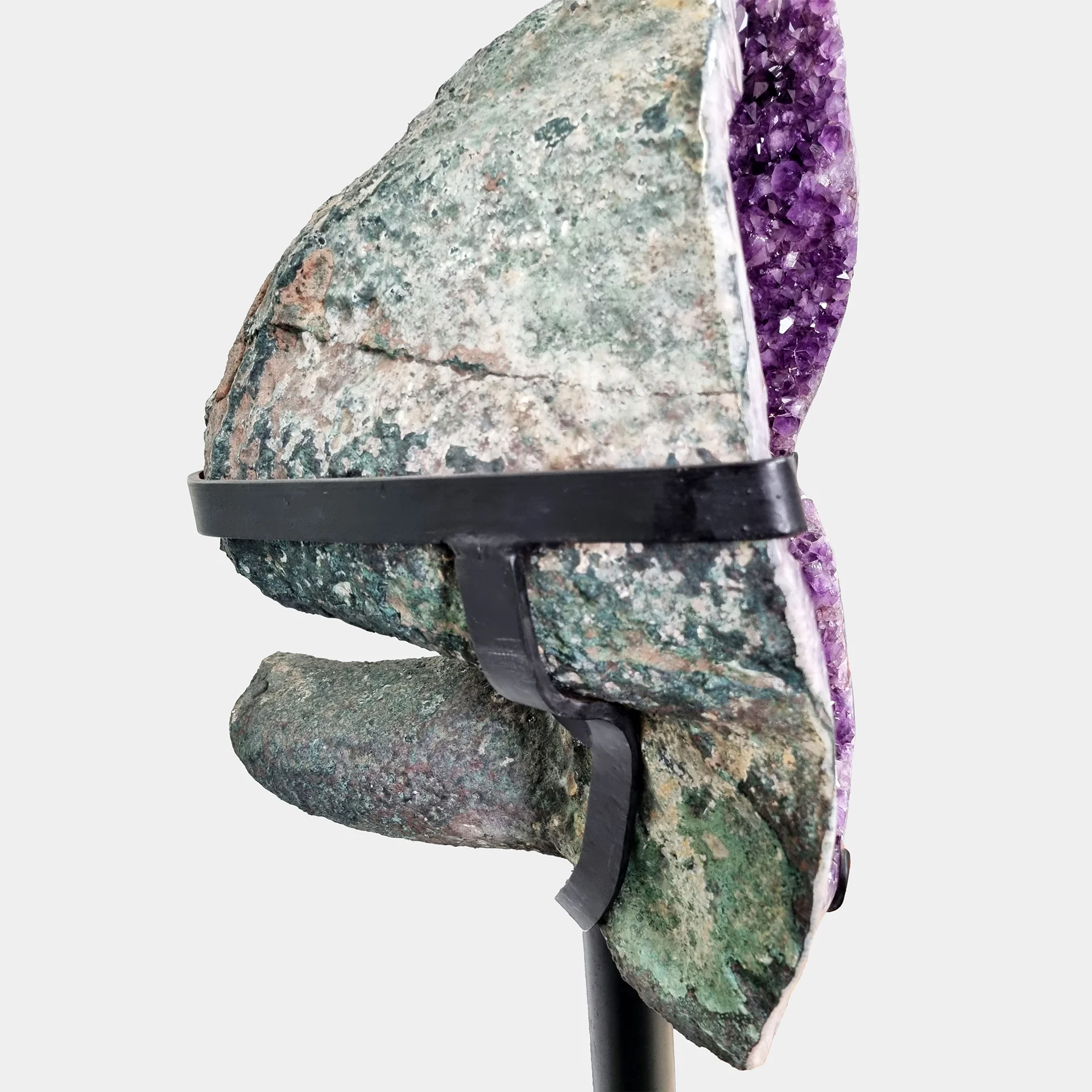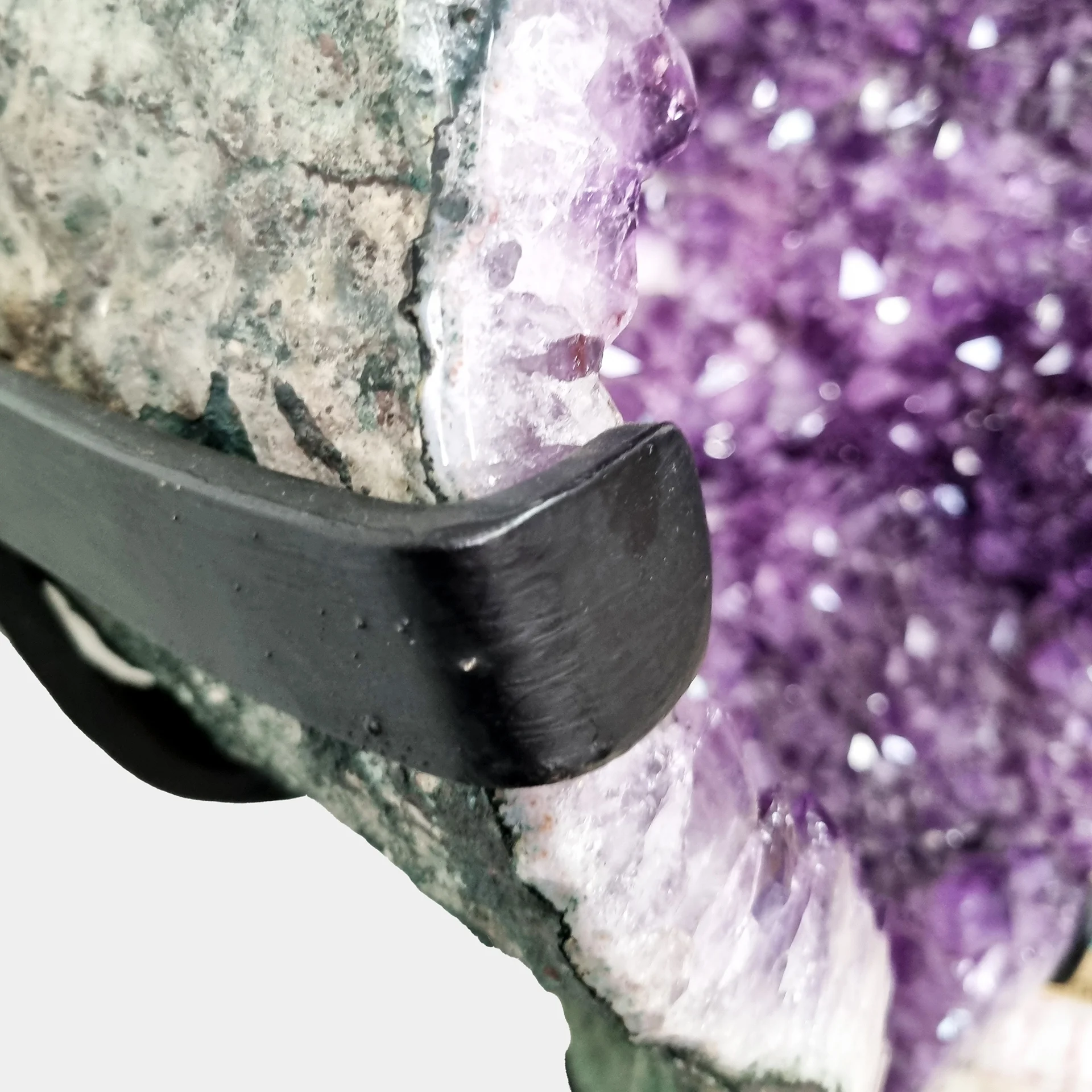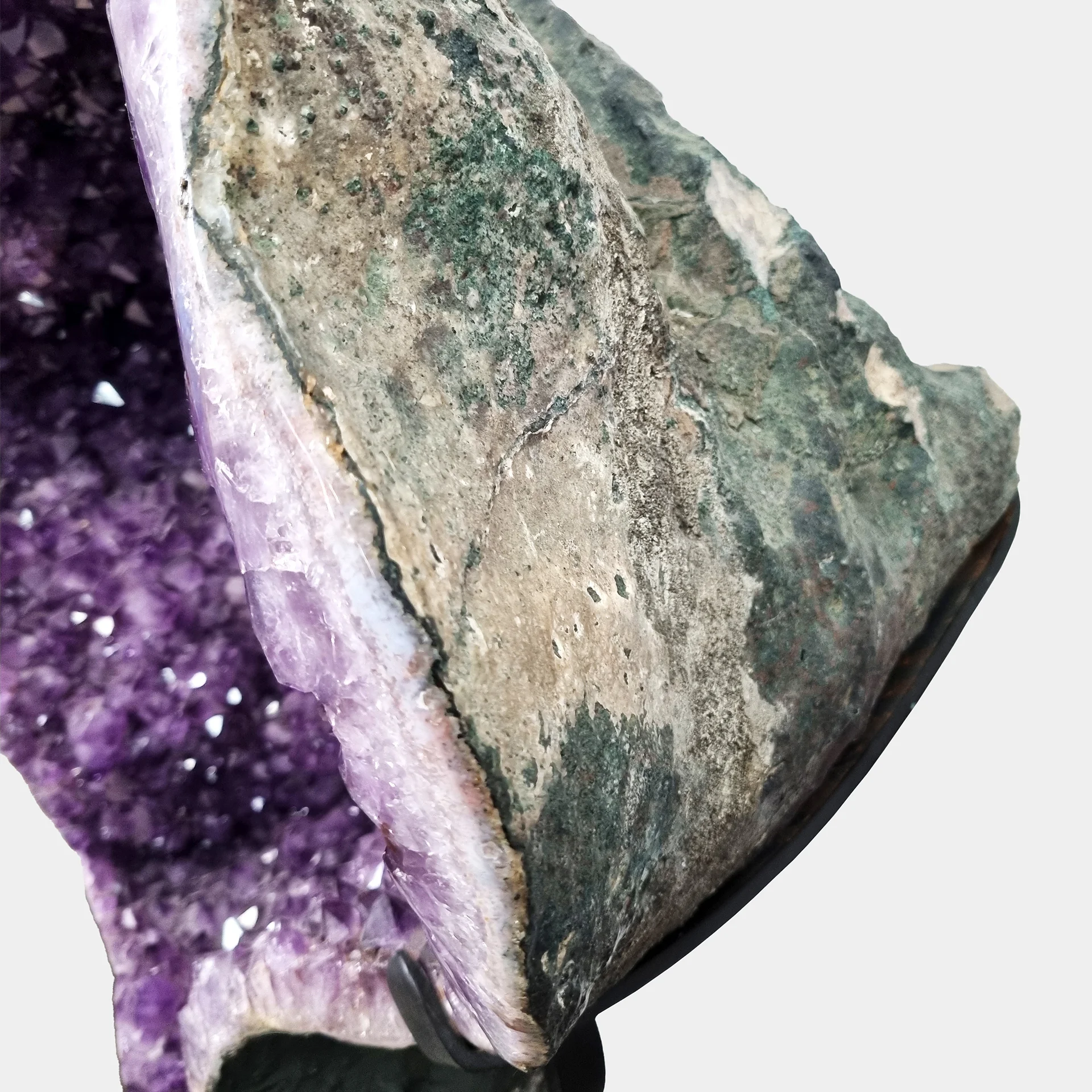 The interior sparkles with densely packed crystal points, shifting from deep royal violet to softer lavender hues as the light moves across the geode. Delicate white quartz borders and a rugged green-grey basalt shell frame the crystals with a refined contrast, giving the piece both visual depth and geological authenticity. Elevated on a minimalist black metal stand, it becomes a sculptural object that blends artistry, craftsmanship, and the timeless appeal of natural stone.