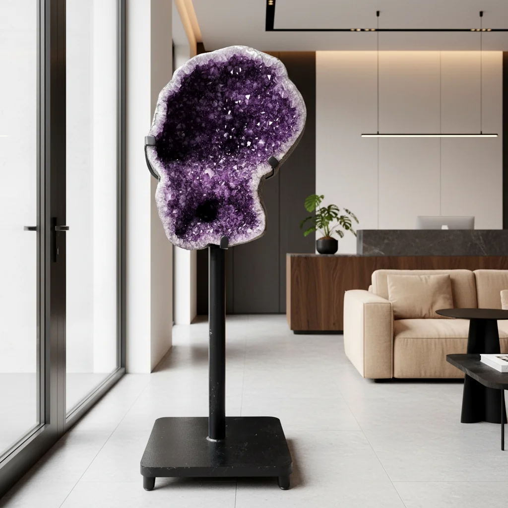 Amethyst Statement Piece N°1 is a striking 160-cm masterpiece, chosen for its powerful vertical form and its rich spectrum of violet tones. Originating from the mineral-rich regions of Brazil, the piece reveals a naturally sculpted crystal chamber that feels both ancient and alive — a rare formation that showcases nature’s quiet grandeur.