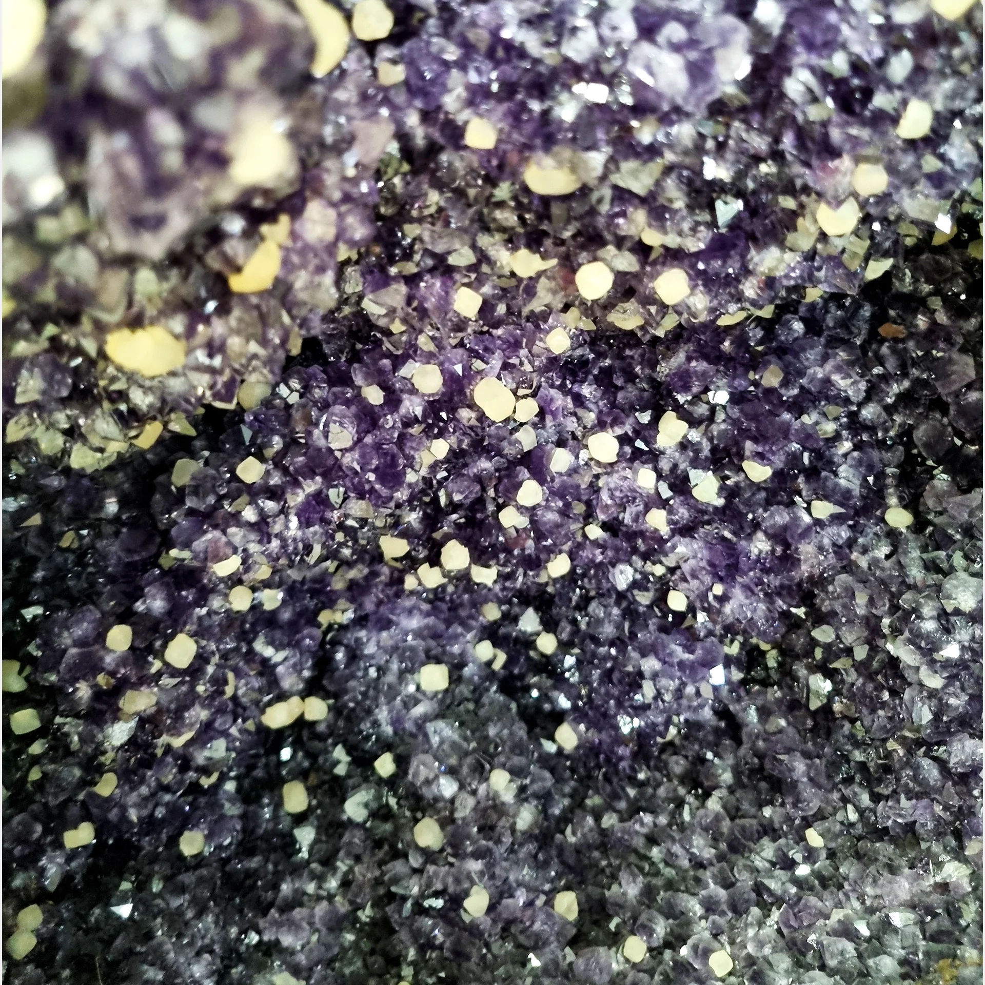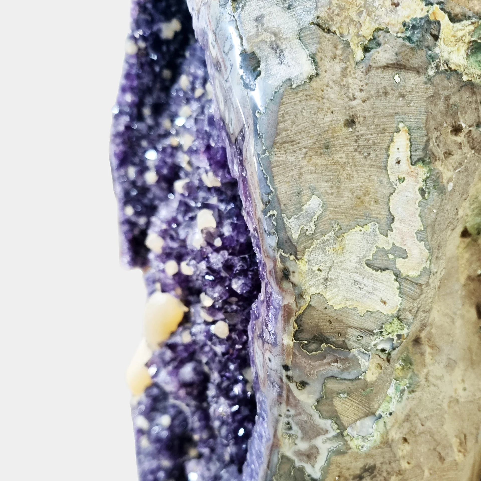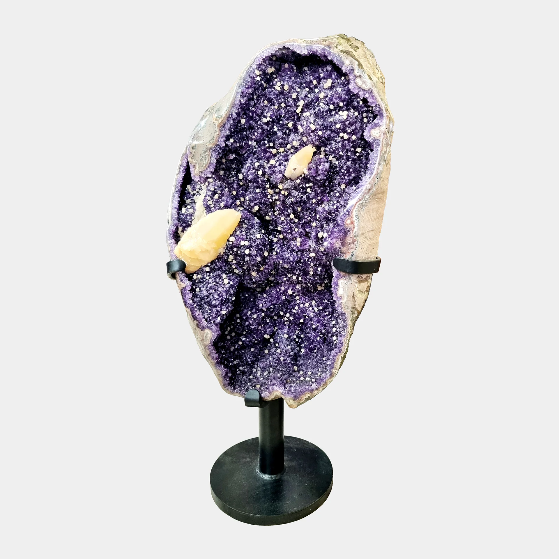 Personally chosen for its deep violet crystals and soft yellow calcite inclusions, this Brazilian Amethyst presents a striking, sculptural presence. Its tall, gracefully curved form and richly textured interior create a captivating balance of color, contrast, and natural artistry.
