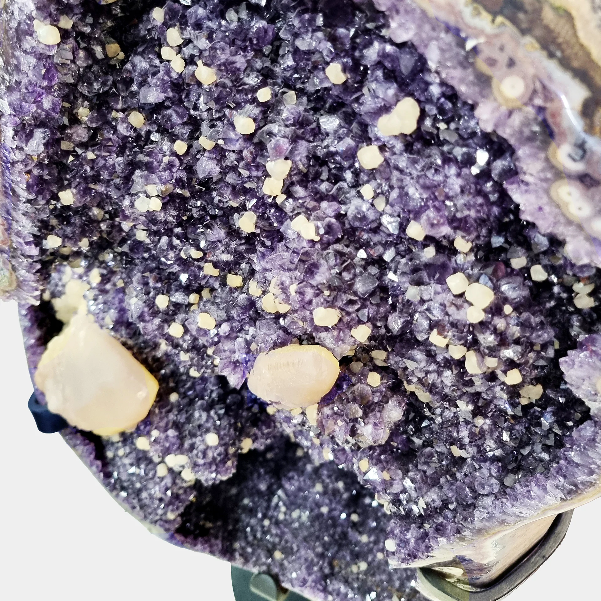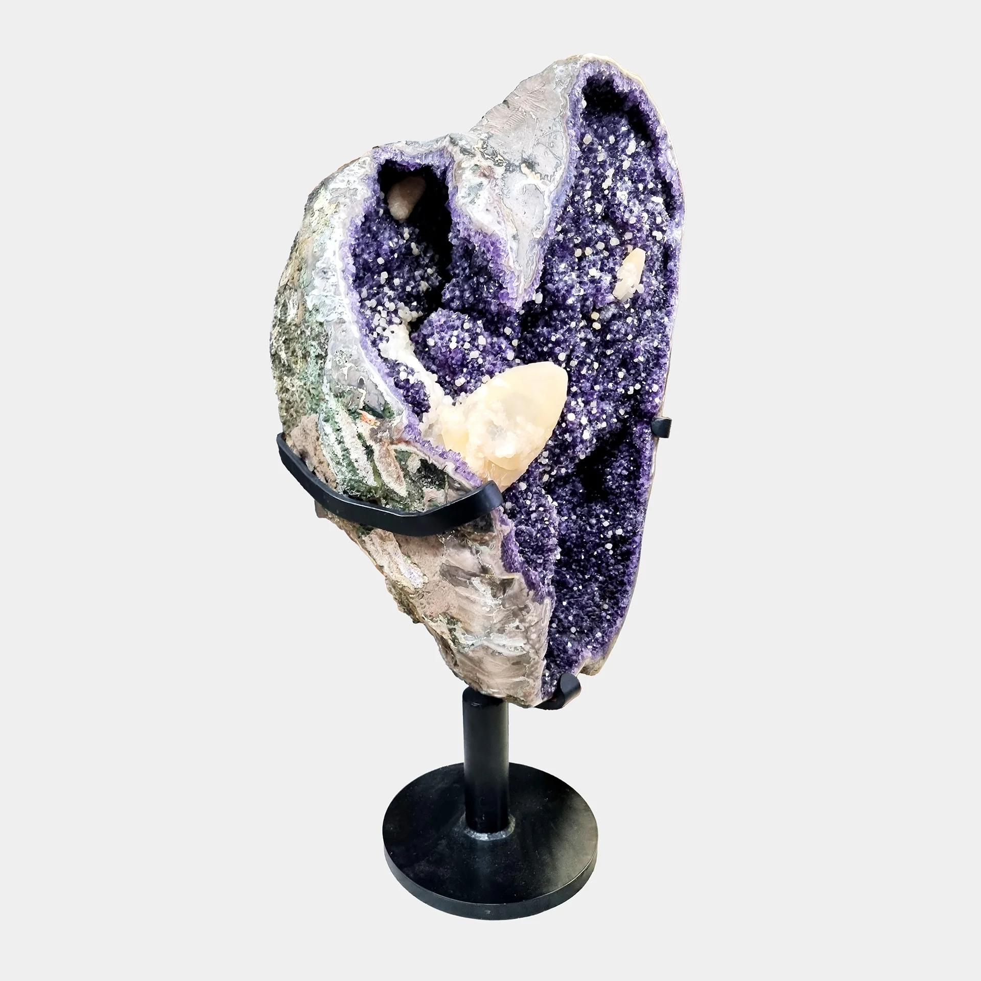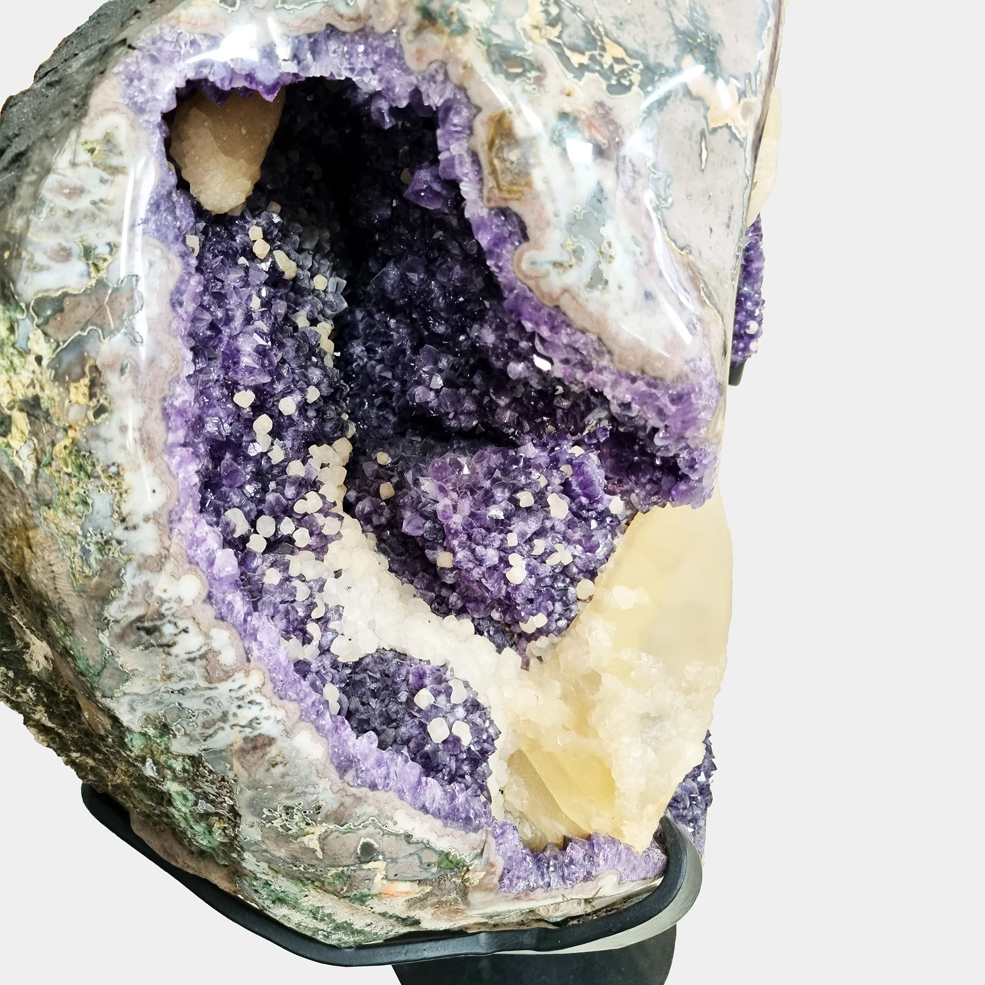 The interior is densely lined with sparkling crystal points, their fine texture enhanced by gentle white quartz layering along the edges. The calcite inclusions add an organic sculptural accent, creating focal points that draw the eye deeper into the geode’s natural architecture. Encased in a rugged basalt shell with earthy green and beige tones, the piece retains its full geological authenticity. Mounted on a sturdy black metal stand, it becomes a refined and substantial artistic statement.