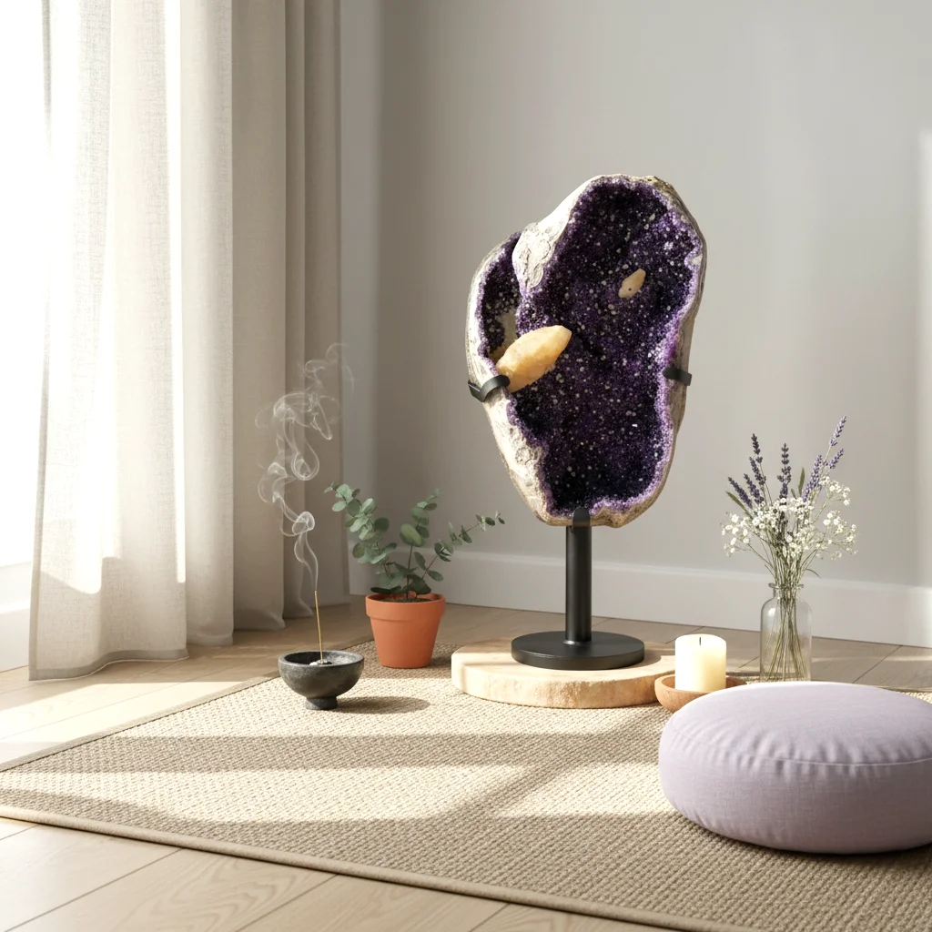 - Direct Sunlight – Prolonged exposure can cause fading over time. Display your Amethyst in a softly lit or shaded area.